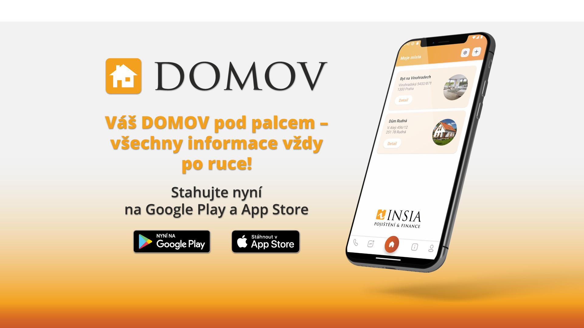 Vyzkoušejte ZDARMA aplikaci z dílny INSIA, která vám poskytne kompletní přehled o vašich nemovitostech a domácnostech! Díky aplikaci DOMOV budete mít veškeré důležité informace o svém domově vždy na dosah. Ke stažení na: